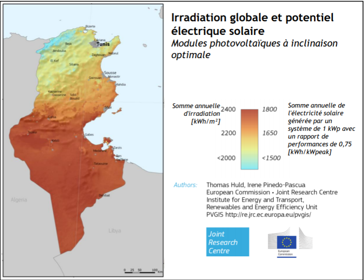 D'après un rapport partager en 2019 par Le Ministère de l’industrie Tunisienne, notre pays a un potentiel exploitable en photovoltaïque de 1650 kWh/kWc, ce qui indique que investir dans un tel projet que ce soit pour le besoin d’une maison de famille ou un petit projet jusqu'au a une capacité de grand projets que ce soit dans le domaine de l'agriculture ou l'industrie.